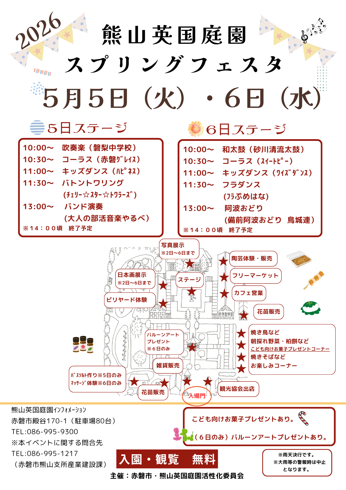 ステージイベント(吹奏楽、歌、踊り、太鼓など)、飲食ブース、展示コーナー、フリーマーケット、花苗販売ほか